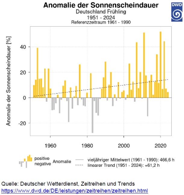 Der Klimawandel belastet die menschliche Gesundheit bereits heute spürbar. Neben Extremwetter-Ereignissen trifft dies auch auf die Intensität der ultravioletten Strahlung der Sonne zu. Diese ist bundesweit in den letzten Jahrzehnten deutlich gestiegen, wie Messungen des BfS zeigen. Auch die Daten des Deutschen Wetterdienstes (DWD) bestätigen einen kontinuierlichen Anstieg der Sonnenstunden im Frühjahr.