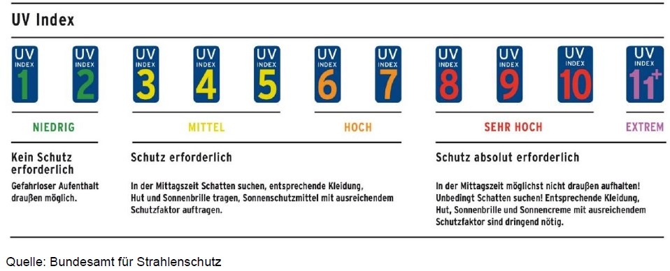 Der Mensch kann UV-Strahlen nicht wahrnehmen. Orientierung im Alltag bietet der UV-Index. Dieses international gültige Maß zeigt auf einer nummerierten Farbskala die Stärke der UV-Strahlung an. „Schützen Sie sich ausreichend vor intensiver UV-Strahlung und senken Sie so langfristig ihr Hautkrebsrisiko“, rät Dr. Franz Kohlhuber, Vorstandsvorsitzender der Deutschen Krebshilfe. „Bereits ab einem UV-Index von 3, der aktuell häufig erreicht und überschritten wird, ist schützende Kleidung, eine Kopfbedeckung, Sonnenbrille und Sonnencreme empfehlenswert.“
